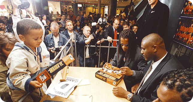 af. Na een kwartiertje wachten komt vanaf de Meent een grijze personenauto aangereden, waaruit een man in een lange zwarte jas stapt. Type security. ,,Ze komen eraan,'' luidt zijn boodschap. Enkele minuten later volgt een lange witte limousine met zwarte ramen. Ook daaruit komt eerst weer zo'n 'lange zwarte jas'. Dan Winston Bogarde, vervolgens zijn broer en tenslotte degeen voor wie de meesten van de honderden wachtenden voor zijn gekomen: Edgar Davids. In rap tempo wordt het gezelschap over de roltrap naar de kelder gedirigeerd waar Selekt 11 (het nieuwe voetbalspel) wordt verkocht. Ook beneden hebben zich inmiddels honderden voetballiefhebbers verzameld. Zij willen een glimp opvangen van hun helden. Davids, met bril op het hoofd, neemt plaats achter de tafel. Met links signeert hij er vrolijk op los: op het deksel van het spel, waarop ook zijn hoofd is te zien, op posters van Oranje, sjaaltjes, vaantjes, shirts van Nederland, Juventus en zelfs van Sparta. Ook een wit damesslipje verschijnt op tafel en onverstoorbaar zet Edje ook daar zijn krabbel op. Het bijbehorende meisje loopt gillend weg en toont haar 'trofee' aan de camera's. ,,Davids! Hé Davids,'' joelen de omstanders. Veiligheidsmensen hebben grote moeite om het publiek in toom te houden. Hekken dreigen om te vallen, de massa vooraan komt in het gedrang. De spreekstalmeester dreigt het spektakel af te blazen als het geduw niet ophoudt. ,,Haha, dan verkoop je niks,'' antwoordt een knaap gevat. Davids signeert ondertussen nietsvermoedend door. Af en toe een grijns, een hand. Veel zegt hij niet. Hij moet in korte tijd honderden keer zijn handtekening hebben gezet. ,,Ik heb 'm nog nooit zo van dichtbij gezien,'' kirt een meisje. Een vrouw heeft andere plannen. ,,Hé Davids, ik kom je dadelijk halen. Je bent lekker, man.'' De held zwijgt. Na drie kwartier wordt de sessie stopgezet. Het drietal wil graag boven nog wat drinken. Dat gaat niet zo maar, want voordat de lift is bereikt, moeten er hier en daar door bewakers rake klappen worden uitgedeeld. Na de verfrissing is een vlucht door een achteruitgang nodig om de massa te ontlopen. Davids in de stad. Rotterdam heeft het geweten. | ||